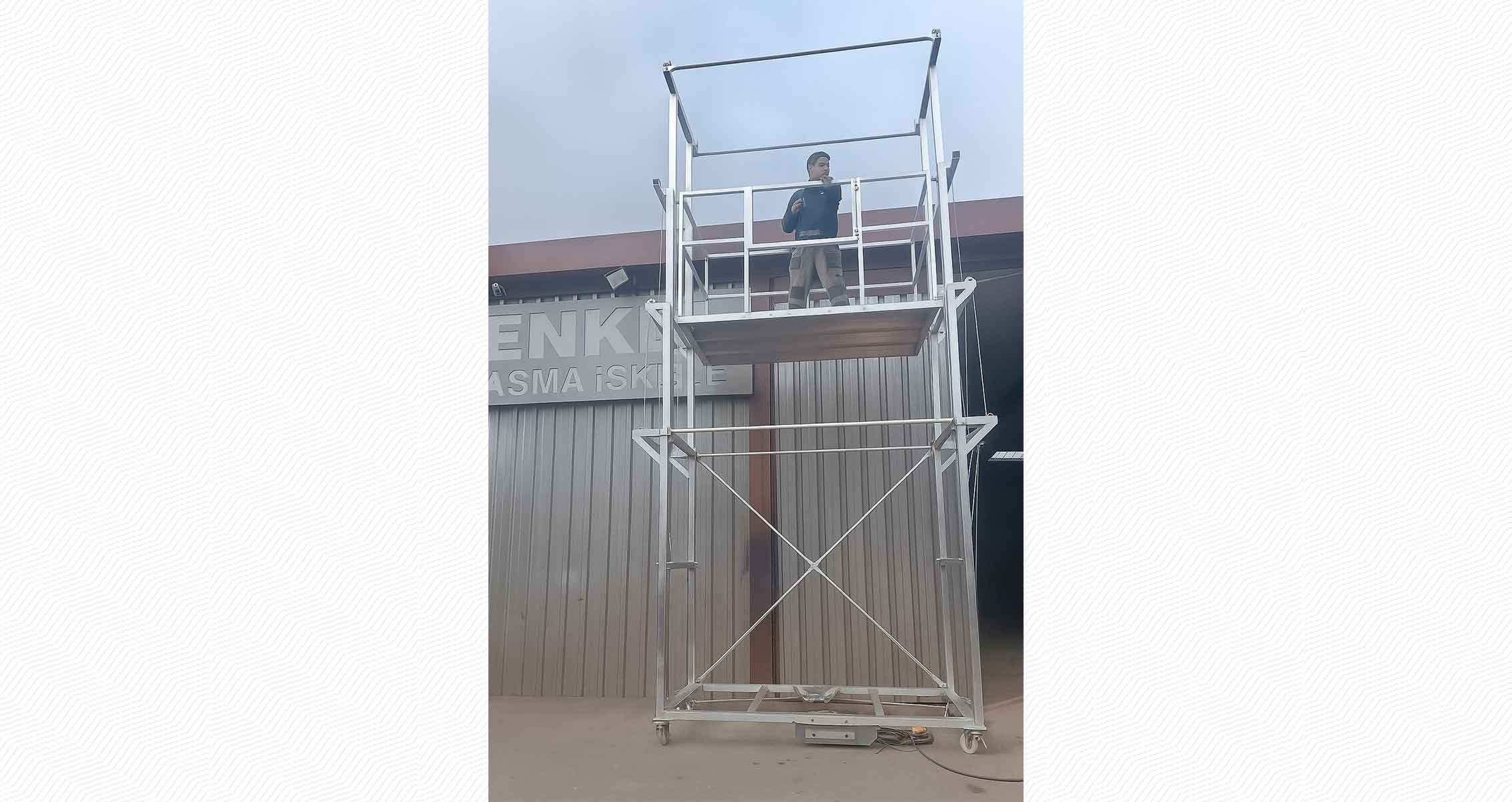 6 mt yüskliğinde çalışma ile hafif ve portatif elektirkili mobil iskelelerimiz, villa, imalat, depo ve benzeri alanlar için tasarlanmıştır.